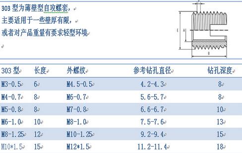 薄壁型西安自攻螺套外观上看主要有两种区分,一种是一端开槽型的,另一种是一端三圆孔型的,其中开圆孔型的又分为307型和308型两种,307型和308型外观主要区别就是同一直径下,长度和外径大小有所区分。以上各种型式螺套均具有自行攻牙功能。